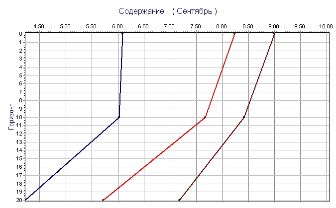 Карское море - Гидрохимия моря - Содержание кислорода в мл/л - Профили (по 1-гр. квадратам)