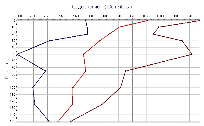 Карское море - Гидрохимия моря - Содержание кислорода в мл/л - Профили (по 1-гр. квадратам)