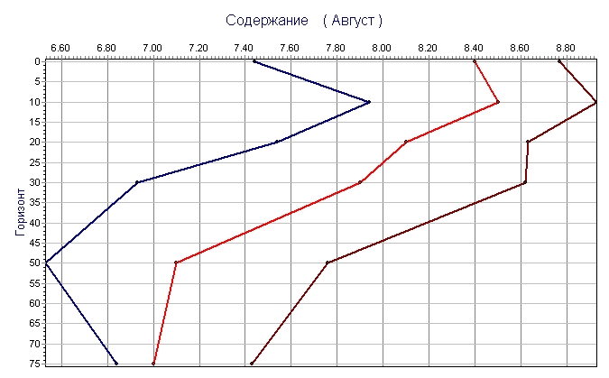 Карское море - Гидрохимия моря - Содержание кислорода в мл/л - Профили (по 1-гр. квадратам)