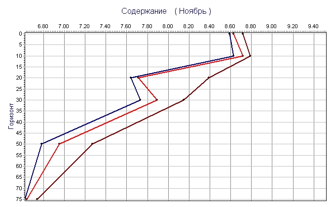 Карское море - Гидрохимия моря - Содержание кислорода в мл/л - Профили (по 1-гр. квадратам)